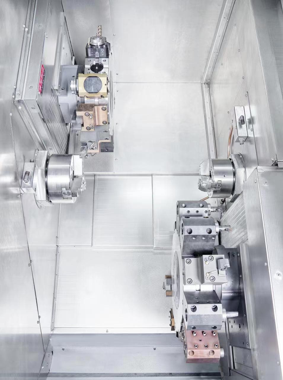 Двухшпиндельный токарно-фрезерный станок с двумя револьверными суппортами Описание: Это высокопроизводительный многофункциональный обрабатывающий центр, представляющий собой вершину автоматизации и производительности в токарной обработке. Он объединяет в одном корпусе два независимых рабочих места, что позволяет обрабатывать две детали одновременно или одну сложную деталь с двух сторон за один установочный цикл, комбинируя токарные и фрезерные операции. Ключевые компоненты и их функции: Два шпинделя (Dual Spindle): Обычно расположены соосно друг напротив друга (левый и правый) или под углом. Функции: Одновременная обработка двух деталей: Каждый шпиндель работает со своей заготовкой, удваивая производительность (например, на левом шпинделе обрабатывается одна сторона детали "А", на правом — одна сторона детали "Б"). Сквозная обработка одной детали: После обработки первой стороны на левом шпинделе, заготовка автоматически передается (например, с помощью захвата правого шпинделя) для обработки второй стороны на правом шпинделе. Это исключает ручную переустановку и гарантирует высочайшую соосность. Два револьверных суппорта (Dual Turret): Каждый суппорт (обычно верхний и нижний, или левый и правый) оснащен собственным набором инструментов (8-12 позиций и более). Функции: Одновременная обработка одной детали двумя инструментами: Это самая мощная функция. Например, один суппорт может точить наружный контур, а второй — одновременно растачивать внутреннее отверстие, что сокращает время цикла на 30-50%. Независимая работа на разных шпинделях: Каждый суппорт может быть закреплен за своим шпинделем для одновременной обработки двух деталей. Гибкость оснастки: В суппорты устанавливаются как обычные токарные резцы, так и приводные (активные) инструменты для фрезерования, сверления и нарезания резьбы. Токарно-фрезерный функционал (Turning and Milling): Оба шпинделя являются шлифованными (C-ось), то есть могут точно позиционировать заготовку под любым углом и вращаться с заданной скоростью. В сочетании с приводными инструментами это позволяет выполнять фрезерование плоских поверхностей, пазов, шлицев, сверление и нарезание резьбы в любом месте детали (по окружности или торцу) без ее переустановки. Принцип работы (пример сквозной обработки): Заготовка зажимается в левом шпинделе. Левый (или верхний) суппорт обрабатывает первую сторону (точение, растачивание). Этот же или второй суппорт с приводным инструментом фрезерует пазы или сверлит отверстия на первой стороне. Правый шпиндель захватывает деталь с торца, левый шпиндель разжимается. Правый шпиндель с деталью и правый (или нижний) суппорт выполняют полную обработку второй стороны. Готовая деталь выгружается. Весь цикл — без участия оператора. Преимущества: Максимальная производительность: Сокращение времени цикла за счет одновременной работы и исключения переустановок. Высочайшая точность: Обработка с двух сторон за один установ обеспечивает идеальную соосность и отсутствие накопления погрешностей. Полная законченность детали: Возможность выполнить ВСЕ необходимые операции (токарные, фрезерные, сверлильные) в одном станке. Снижение себестоимости: Экономия на оборудовании, площадях, операторах и промежуточных складах. Сфера применения: Массовое производство сложных деталей для автомобил